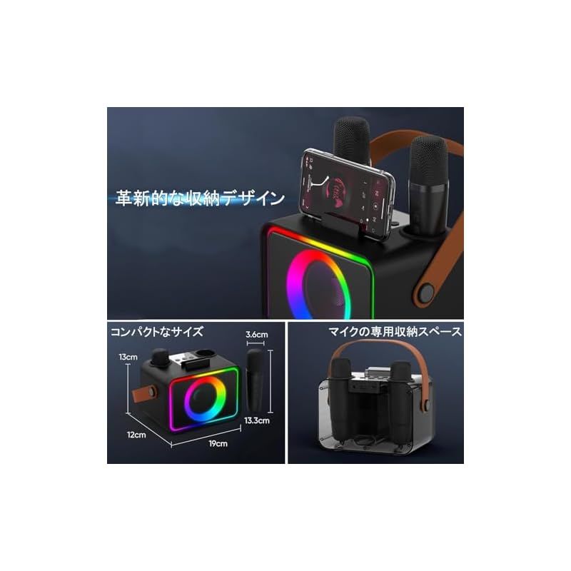 HolyCrab カラオケセット 最新デザイン登場 高低音強化機能搭載 Bluetooth5.3 ワイヤレスマイク2本 デュアルパッシブラジエーター RGB LEDリズムライトエフェクト AUX USB TF対応 家庭パーティー カラオケ 誕生日パーティー 1