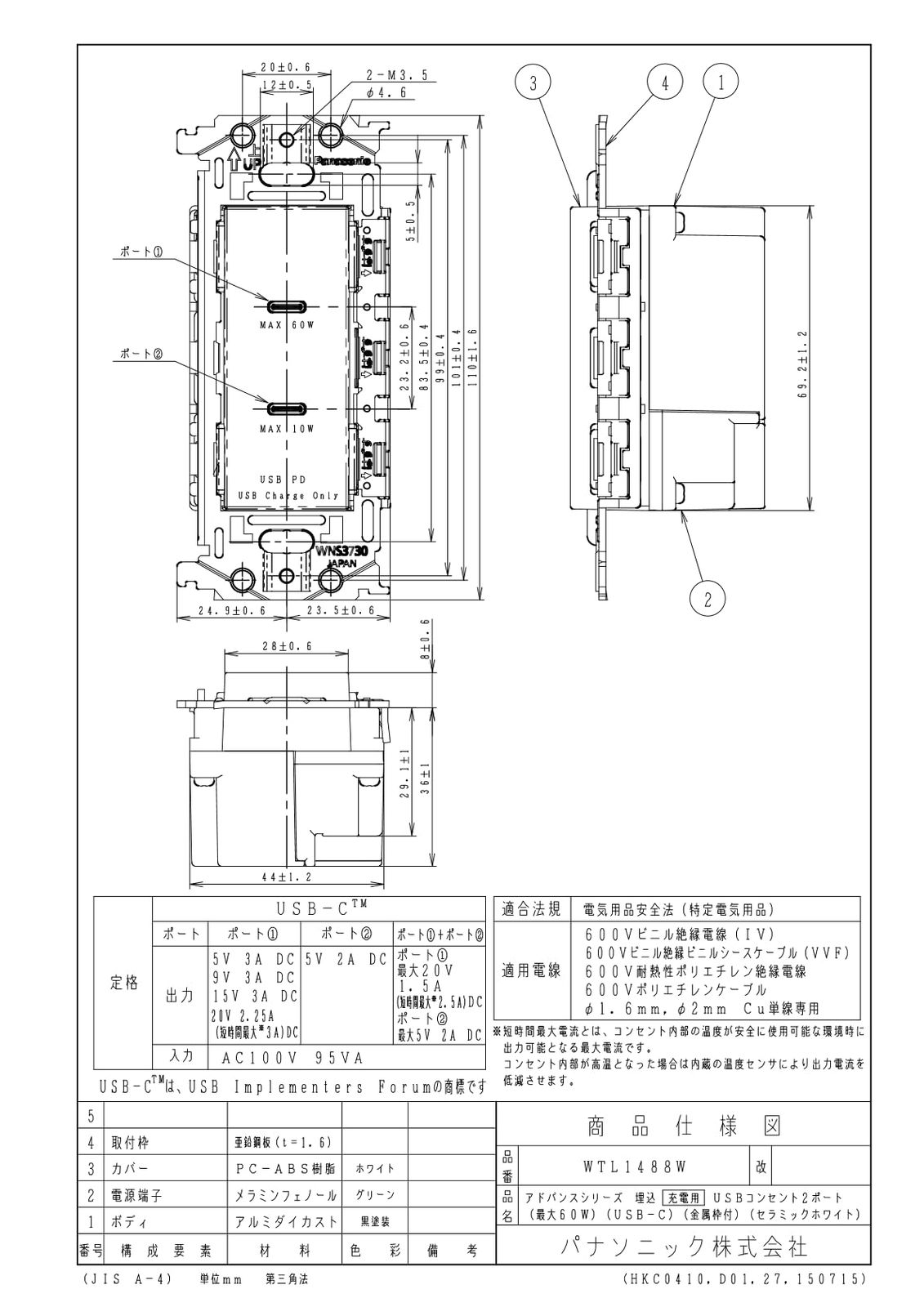 パナソニック Panasonic 埋込充電用USBコンセント アドバンスシリーズ 金属枠付 USB-C 60W 2ポート セラミックホワイト 幅48.4×奥行44×高さ110mm WTL1488W ROLENORIO_COM_BR
