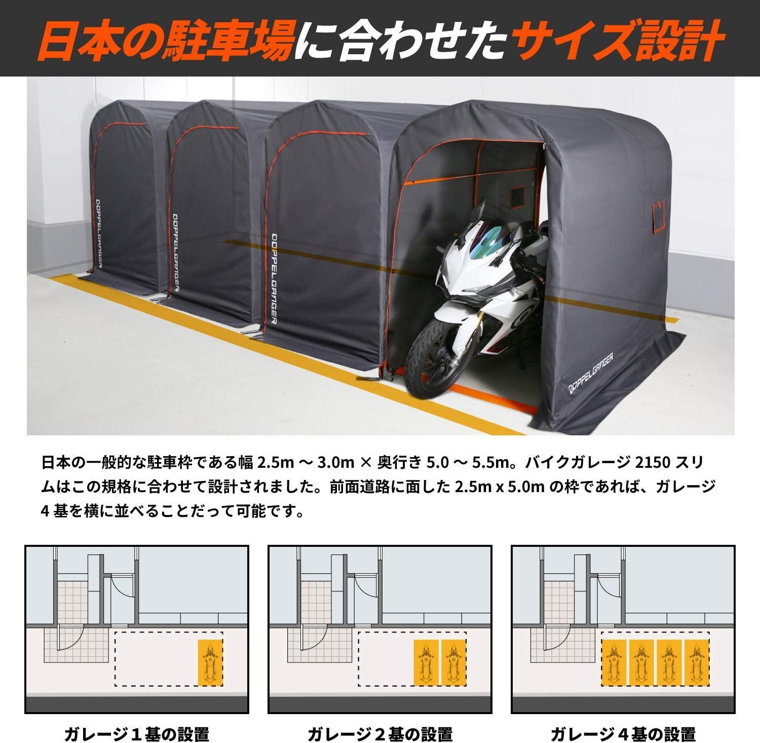 ドッペルギャンガー バイクガレージ 奥行2150mm 屋外簡易車庫 中型バイク のスリムなガレージ W115×L D 215×H175cm DCC539-GY グレーの検索結果