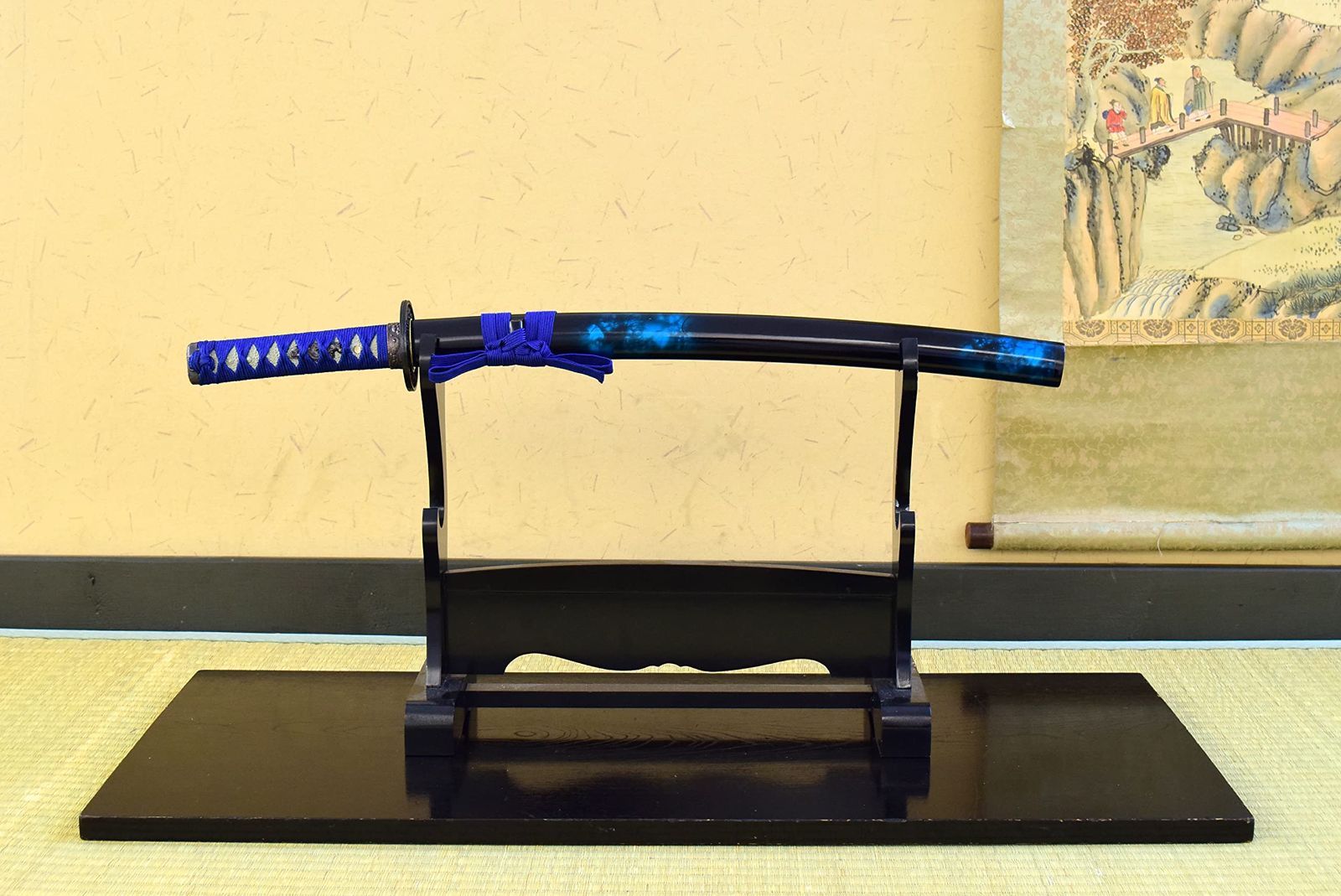 仕様:刀身 亜鉛合金(クロムメッキ仕上げ)、柄 樹脂製、鍔 合金製、鞘 木製(光沢マーブル仕上げ)