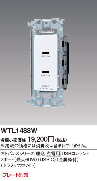 パナソニック Panasonic 埋込充電用USBコンセント アドバンスシリーズ 金属枠付 USB-C 60W 2ポート セラミックホワイト 幅48.4×奥行44×高さ110mm WTL1488Wの検索結果